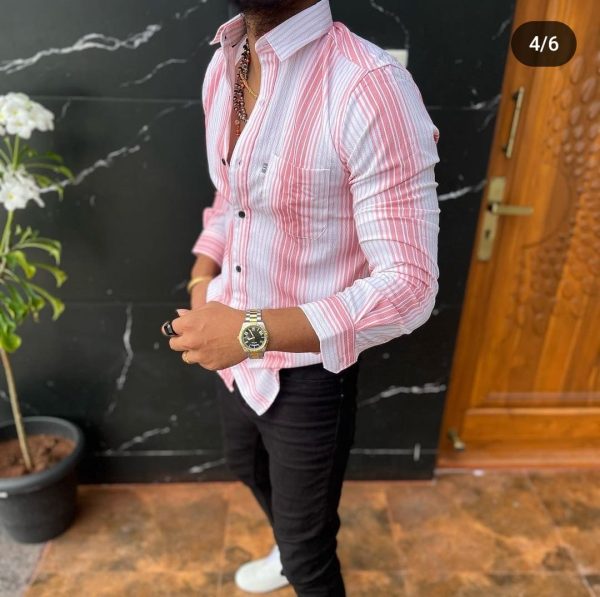 This pink and white striped shirt is a stylish and versatile addition to any wardrobe. The vertical stripes create a slimming effect, while the rolled-up sleeves add a casual touch. Made from high-quality fabric, it ensures comfort and durability. Perfect for both casual and semi-formal occasions, this shirt pairs well with black trousers for a sleek and modern look.