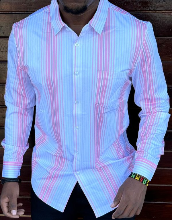 This meticulously crafted striped slim fit dress shirt is a wardrobe essential for the modern man. The combination of light blue, pink, and white stripes exudes sophistication, making it suitable for both formal occasions and casual outings. Its tailored design ensures a flattering fit, while the high-quality fabric guarantees comfort throughout the day. Button it up for a polished look or roll up the sleeves for a more relaxed vibe.